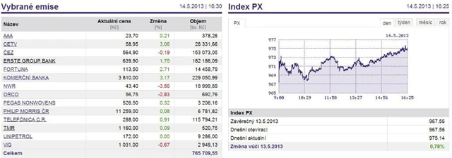 Pražská burza v úterý dále rostla. Index PX posílil o 0,78 % a zakončil na 975,14 bodu. Nahoru ho táhly především akcie Komerční banky (+3,17 %) a CETV (+3,06). V úterý pronikla na veřejnost zpráva, že společnost Time Warner podala oficiální žádost k Evropské komisi na spojení se společností CME. Posilovaly i cenné papíry Fortuny (+2,71 %) a Erste Group Bank (+1,75 %).