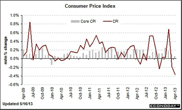 Meziroční nárůst cen ve spojených státech byl v dubnu meziročně nejnižsí od listopadu 2010. Meziměsíčně spotřebitelské ceny klesly o 0,4 %, nejvíce od prosince 2008 a o desetinu více, než se čekalo díky prudkému propadu cen benzínu. Bez zahrnutí cen potravin a pohonných hmot vzrostly o 0,1 %.