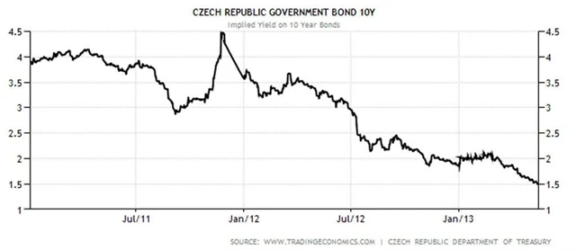 Výnos českých desetiletých dluhopisů klesl letos už o 35 bazických bodů, v pátek klesl na rekordních 1,49 %.