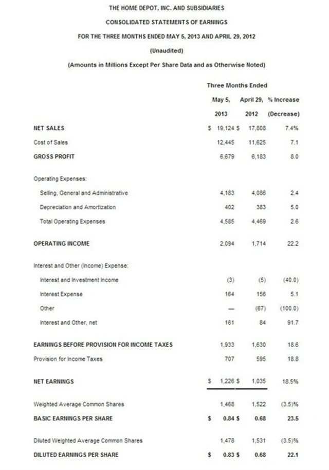 Společnost Home Depot v prvním čtvrtletí letošního roku dosáhla zisku na akcii 0,83 USD (1,2 miliardy USD) oproti očekávávaným 0,76 USD (v 1Q2012 0,68 USD). Predikce překonaly i tržby - 19,12 miliardy USD (odhad: 18,63 miliardy USD), které meziročně vzrostly o 7,4 %.