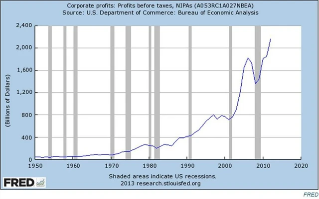 Následující dva grafy pomohou objasnit, proč se Senát tolik zabývá daněmi Applu. Na první grafu můžeme vidět, že zisky amerických firem od roku 1950 míří raketově vzhůru.