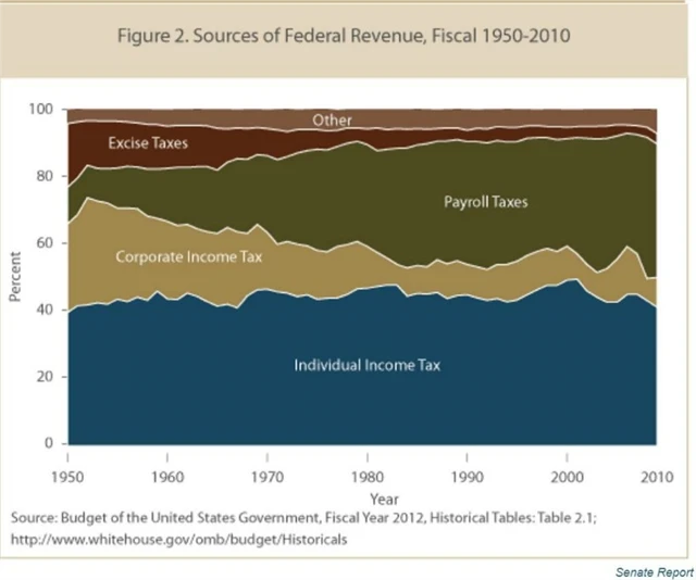 Zatímco druhý graf jasně ukazuje, že procentuální podíl korporátních daní na příjmu vlády z daní je nejnižší v historii.
