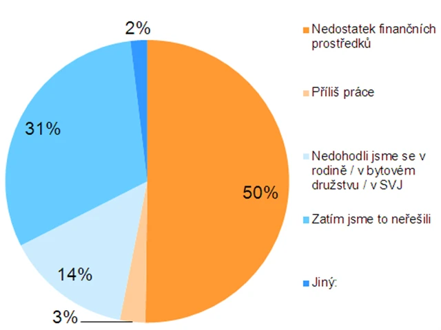 I přes často zbytečně vysoké náklady za energie, které hradí, se mnoho Čechů vyhýbá rekonstrukcím. Pro polovinu z nich jsou důvodem finance, necelá třetina se problémem nezabývá a 14 % se dosud nedohodlo v rodině, v bytovém družstvu nebo společenství vlastníků bytových jednotek.