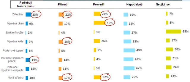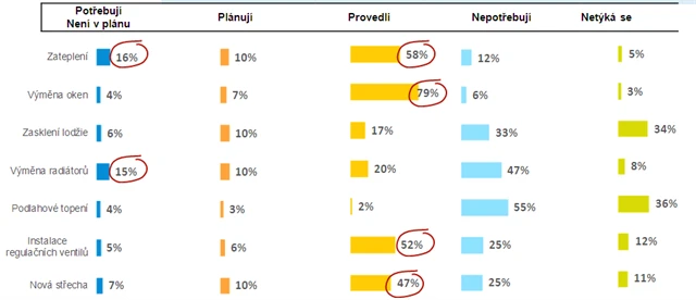 Obyvatelé rodinných domů nejvíce potřebují zateplení fasády, ale paradoxně nejčastěji realizovanou rekonstrukcí je výměna oken. Tu provedla již polovina dotázaných majitelů. Podobně je tomu u bytových domů, výměnu oken realizovalo už téměř 80 % vlastníků bytů.