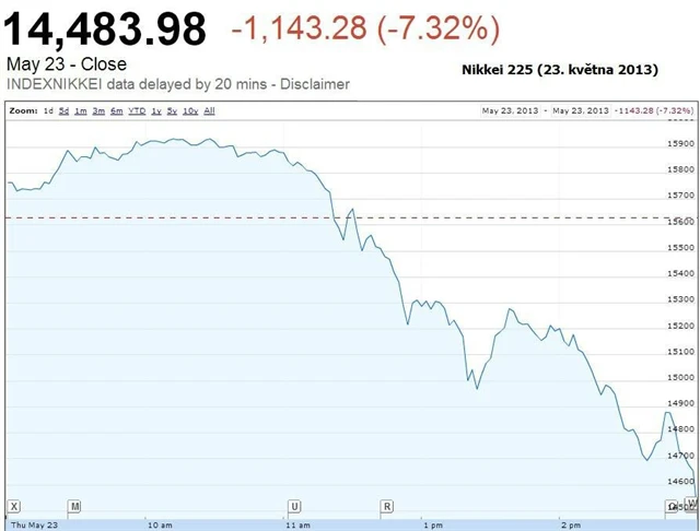 Nikkei zažil ve čtvrtečním obchodování největší jednodenní propad za poslední dva roky a jedenáctý největší v historii. Ztratil 7,32 %, 1 143 bodů, a zakončil na 14 483,98 bodu. Širší Topix odepsal nejvíce od března 2011, kdy Japonsko zasáhla tsunami a došlo k havárii v jaderné elektrárně Fukušima. Klesl o 6,87 %. Výnos japonských státních desetiletých dluhopisů se poprvé za poslední rok dotkl jednoho procenta.