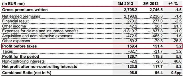 Čistý zisk VIG v 1Q2013 dosáhl 123,8 milionu EUR, zisk před zdaněním 159,4 milionu EUR a hrubé předepsané pojistné bylo 2,7052 miliardy EUR.