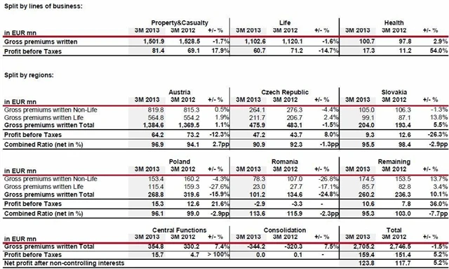 Rakouská pojišťovací skupina Vienna Insurance Group oznámila výsledky za první kvartál 2013. Předepsané pojistné bylo v souladu s odhady, zisk před zdanění mírně nad nimi.