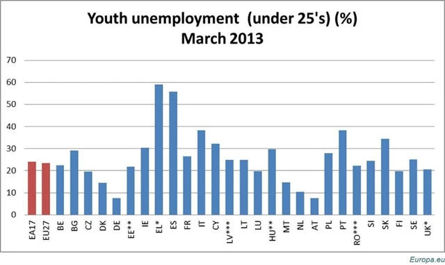 V březnu bylo v evropské sedmadvacítce bez práce 5,7 milionu mladých lidí, z nichž 3,6 milionu nenašlo práci v eurozóně. Míra nezaměstnanosti mladých dosahuje v EU27 23,5 % a 24 % v eurozóně, meziměsíčně zůstává víceméně nezměněna, v meziročním srovnání je však v EU27 o 0,9 % a v eurozóně o 1,5 % vyšší. Nejnižší byla v březnu v Německu (7,6 %) a Nizozemsku (10,5 %), nejvyšší naopak v Řecku (59,1 % v lednu letošního roku), Španělsku (55,9 %), Itálii (38,4 %) a Portugalsku (38,3 %).
