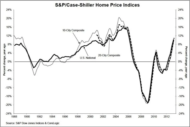 Index cen domů ve dvaceti městských oblastech ve Spojených státech v březnu meziměsíčně vzrostl o 1,1 %, což o desetinu překonalo odhady analytiků. V meziročním srovnání se ceny zvýšily o 10,9 %, nejvíce od dubna 2006. Za celé první čtvrtletí domy podražily o 10,2 % oproti stejnému období minulý rok.