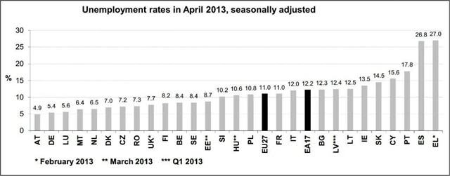 "Eurozóna zkrátka v tuto chvíli nemůže stlačit nezaměstnanost dolů," říká Jonathan Loynes, hlavní ekonom Capital Economics v Londýně. "Celková míra nezaměstnanosti reflektuje nerovnosti mezi jednotlivými zeměmi a ukazuje, že cyklicky a strukturálně rozdílné ekonomiky zkrátka nedokážou žít pohromadě s jednou měnou a úrokovými sazbami," dodal.