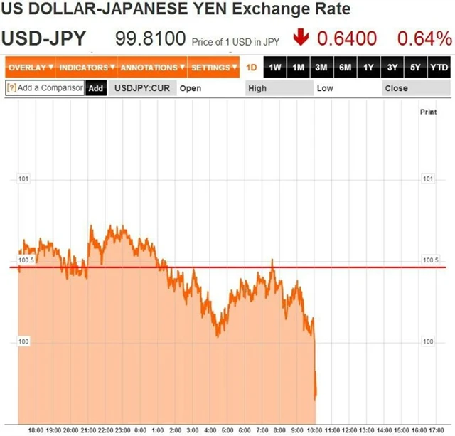 Japonský jen posílil vůči dolaru poprvé od 9. května pod hranici 100 USD/JPY. Posílil o více než půl procenta na 99,81 USD/JPY.