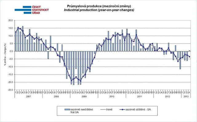 Průmyslová produkce v dubnu 2013 meziročně reálně vzrostla o 0,5 %, po očištění od vlivu počtu pracovních dnů klesla o 3,4 %. Duben 2013 měl ve srovnání se stejným měsícem předchozího roku o 1 pracovní den více. Po očištění od sezónních vlivů (včetně vlivu počtu pracovních dnů) byla průmyslová produkce meziměsíčně nižší o 0,7 %. K meziročnímu růstu průmyslové produkce nejvíce přispěla odvětví výroba kovových konstrukcí a kovodělných výrobků (příspěvek +0,8 procentního bodu, růst o 9,4 %), výroba elektrických zařízení (příspěvek +0,7 p.b., růst o 10,8 %) a výroba strojů a zařízení (příspěvek +0,6 p.b., růst o 6,6 %).