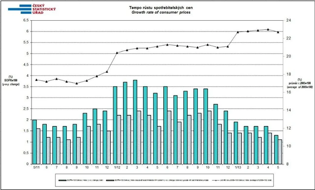 Meziročně vzrostly spotřebitelské ceny v květnu o 1,3 %, což je o 0,4 procentního bodu méně než v dubnu. Na zpomalení cenového růstu se podílely především ceny v oddíle bydlení, kde ceny zemního plynu přešly z meziročního růstu o 2,1 % v dubnu v pokles o 4,2 % v květnu. V oddíle alkoholické nápoje a tabák zmírnil cenový růst lihovin na 7,1 % z 8,2 % v dubnu. V oddíle pošty a telekomunikace se zvýraznil cenový pokles vlivem cen telefaxových a telefonických služeb, které klesly v květnu o 9,8 % (v dubnu o 6,4 %). Mírně se prohloubil i pokles cen pohonných hmot, které byly nižší o 4,3 % (v dubnu o 3,7 %).