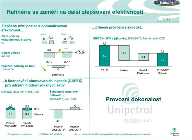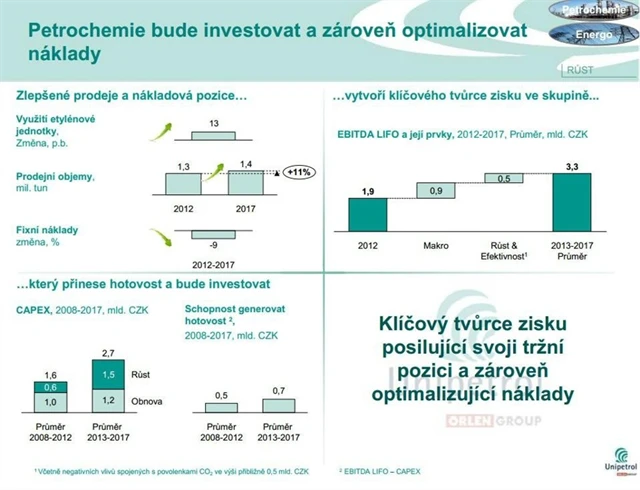 Investice mají proti minulé strategii z let 2008 až 20012 vzrůst z 2,6 miliardy korun na 3,8 miliardy Kč ročně. Většina investic bude směřovat do petrochemického segmentu a rozvoje energetiky. Peníze chce získat zlepšováním svých tržních podílů a zvyšováním efektivnosti. Provozní zisk (EBITDA LIFO) by měl vzrůst z 3,6 miliardy Kč v roce 2012 na průměrných pět miliard Kč v letech 2013 až 2017.
