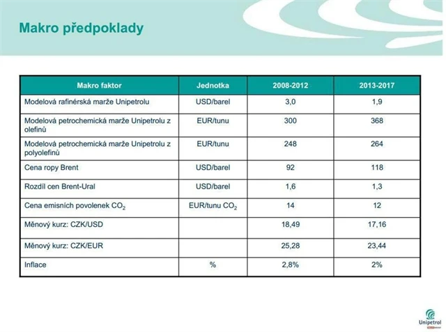 Unipetrol ve své strategii předpokládá, že koruna v nadcházejících letech posílí proti euru i dolaru. Zároveň očekává, že se cena ropy Brent bude pohybovat na úrovni 118 dolarů za barel a cena emisních povolenek na úrovni 12 eur za tunu oxidu uhličitého (CO2). V současnosti se cena ropy pohybuje kolem 104 eur za barel, povolenky se obchodují na úrovni pěti eur za tunu CO2.