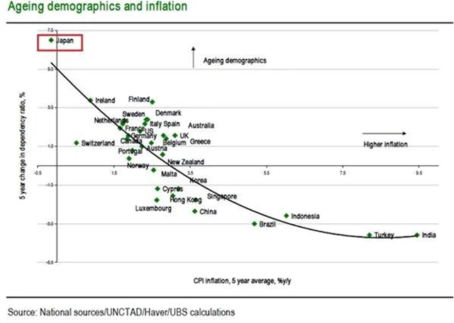 Země se stárnoucí populací mají většinou nízkou inflaci, kdežto ve státech, kde obyvatelstvo mládne, bývá růst cen vysoký. Zjistil to výzkumný tým švýcarské banky UBS. Pro centrální banky vyspělých a vesměs stárnoucích zemí tak bude demografie představovat důležitý faktor v jejich strategii dosahování rovnováhy mezi inflací a ekonomickým růstem.