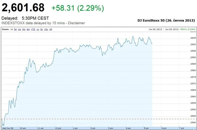 Evropské akcie rostly druhý den v řadě díky uklidnění trhů ohledně likvidity v Číně a lepší než očekávané důvěře německých spotřebitelů. Dále se propadalo zlato, v průběhu dne se zřítilo až na 1 224 dolarů za unci, a spolu s ním ztrácely i akcie těžařských firem.