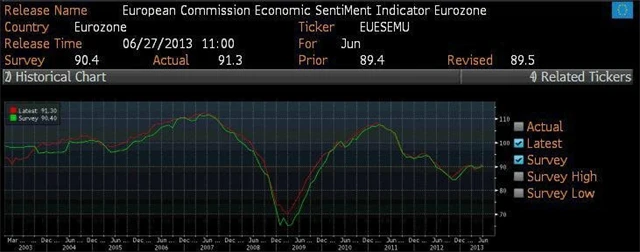 Důvěra v ekonomiku eurozóny narostla v červnu více, než se čekalo. Pomohl jí zejména průmysl, kde důvěra narostla z -13 na -11,2 (při očekávání -12,3). Spotřebitelská důvěra stagnovala na -18,8 v souladu s očekáváním a služby dokonce klesly z -9,3 na -9,5 (čekal se růst na -8,0).