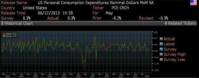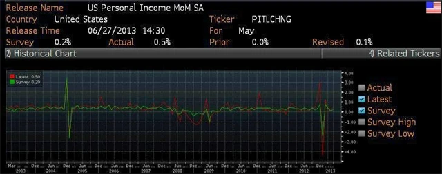 Růst osobních příjmů za květen v USA výrazně pozitivně překvapil (0,5 % meziměsíčně, čekalo se 0,2 %), zatímco výdaje rostly v souladu s očekáváním (0,3 % meziměsíčně).
