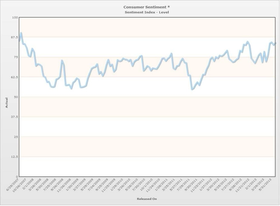 Spotřebitelská důvěra v červnu nedopadla tak špatně, jak se původně očekávalo. Předběžný index sestavený Michiganskou univerzitou v polovině června počítal se snížením na 82,7 bodu z květnových 84,5 bodu, nakonec se však snížil jen o 0,4 bodu na 84,1 bodu.