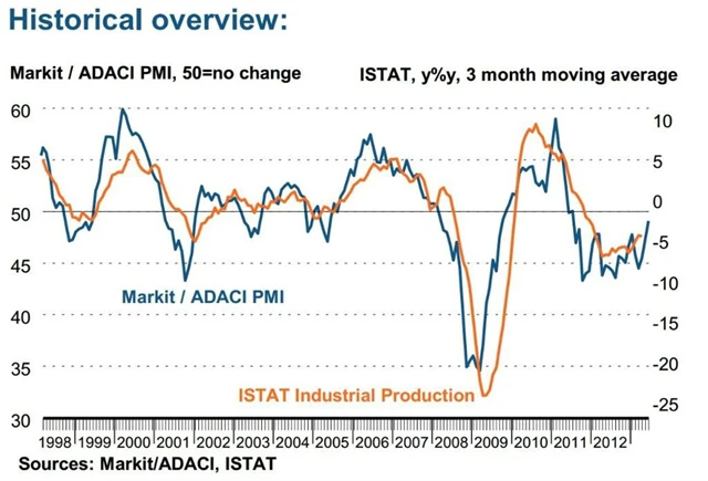 Zpracovatelský sektor v Itálii se v červnu přiblížil padesátibodové hranici. Nové zakázky klesaly pomalejším tempem díky zvýšenému exportu a ceny vstupů se snižovaly již čtvrtý měsíc v řadě. Produkce sektoru vzrostla poprvé od září 2011.