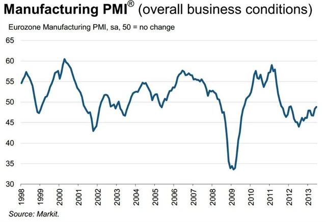 Zpracovatelský sektor eurozóny se na konci druhého čtvrtletí letošního roku posunul o krok blíže stabilitě. Pokles produkce i nových zakázek se zpomalil a průměrný PMI za celé čtvrtletí (47,9 bodu) byl nejvyšší od prvního kvartálu roku 2012. I přesto se však index už od srpna 2011 nachází pod hranicí padesáti bodů oddělující expanzi od propadu v odvětví.