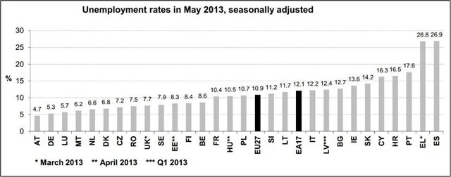 V celé evropské sedmadvacítce míra nezaměstnanosti v květnu zůstala nezměněna na 10,9 % a se zahrnutím nového člena EU, Chorvatska, stagnovala míra nezaměstnanosti na 11 %. Dále roste počet nezaměstnaných ve Španělsku (26,9 % oproti dubnovým 26,8 %), na Kypru (16,3 % vs. duben 15,8 %) a ve Slovinsku (11,2 % oproti 11,1 % v dubnu). Nezaměstnanost naopak klesla v Portugalsku (17,6 % z dubnových 17,8 %). Míra nezaměstnanosti v České republice zůstala zachována na 7,2 %.