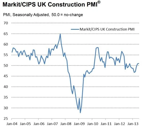 Stavebnictví ve Spojeném království roste již druhý měsíc za sebou a v červnu si připsal sektor nejrychlejší expanzi od května 2012. Index aktivity sektoru v červnu vyskočil na 51 bodů z květnových 50,8 bodu. Ekonomové sice očekávali vyšší růst na 51,2 bodu, i přesto se však jedná o nejlepší výsledek za poslední rok.