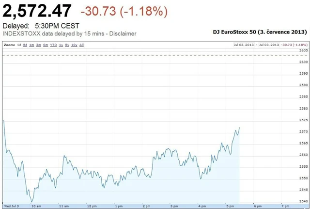 Britský FTSE 100 odepsal 1,17 %, francouzský CAC 40 1,08 % a německý DAX 1,03 %. Portugalský burzovní index PSI 20 v reakci na vládní krizi spadl o 5,31 %.