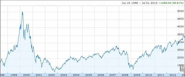 Investiční poradci tvrdošíjně opakují, že bychom měli investovat dlouhodobě. Podívejte se ale na měsíční graf S&P 500 za posledních patnáct let a udělejte si obrázek sami.