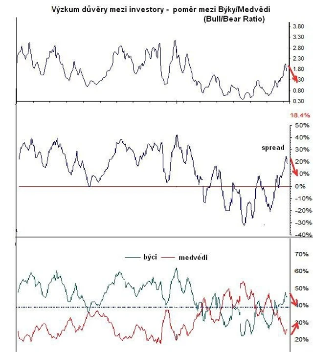 poměr profesionálních investorů naladěných optimisticky (býků) proti pesimistům na trhu (medvědům)
