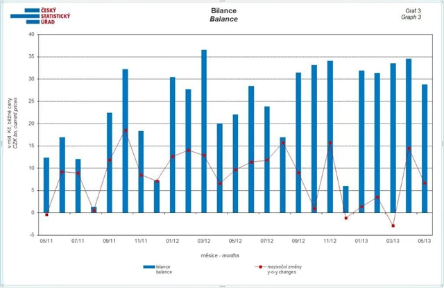 Podle předběžných údajů přeshraniční statistiky se v květnu meziročně v běžných cenách snížil vývoz o 0,8 % a dovoz o 3,7 %. Obchodní bilance skončila přebytkem 28,8 miliardy Kč, který byl meziročně o 6,7 miliardy Kč vyšší.