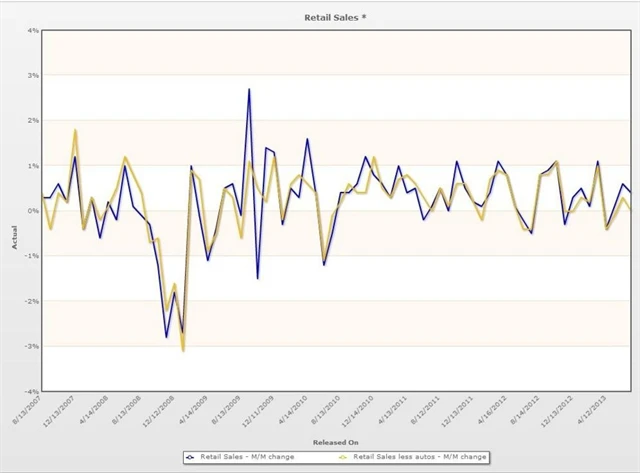 Maloobchodní tržby v květnu vzrostly o 0,4 %, přestože se čekal silnější růst o 0,8 %. Bez aut stagnovaly, přestože se čekal růst 0,5 %. Bez aut a pohonných hmot dokonce klesly o 0,1 % při čekaném růstu 0,3 %.