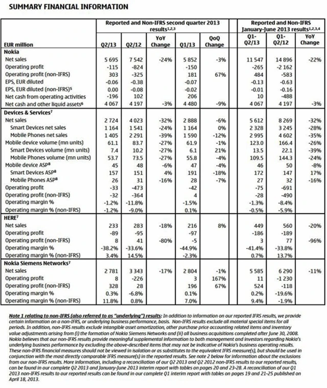 Nokia dodala zákazníkům od dubna do června 7,4 milionu chytrých telefonů Lumia, což proti prvnímu čtvrtletí znamenalo nárůst o 32 %, Analytici ale podle ankety agentury Reuters čekali odbyt 8,1 milionu přístrojů. Prodej běžných mobilních telefonů dosáhl 53,7 milionu, což bylo 2,5 milionu pod odhady.