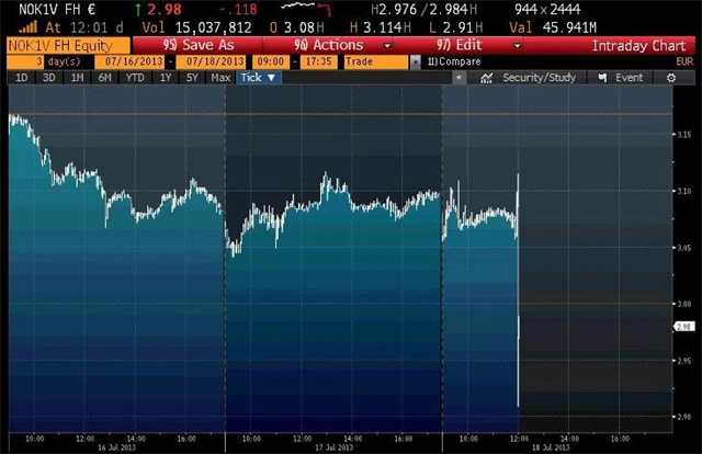 Výsledky Nokia ve 2Q2013: zisk na akcii 0,00 EUR (odhad -0,024 EUR), tržby 5,7 miliardy EUR (odhad: 6,376 miliardy EUR)