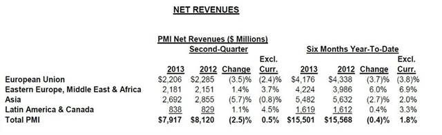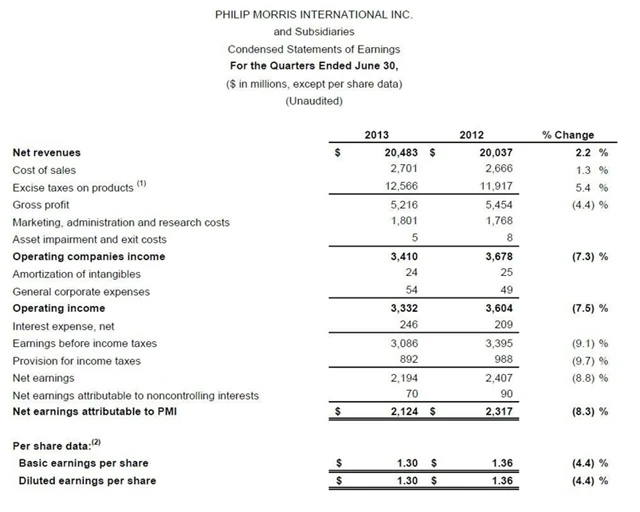 Výsledky Philip Morris International ve 2Q: Zisk na akcii 1,30 USD (odhad: 1,41 USD), čisté tržby 7,9 miliardy USD