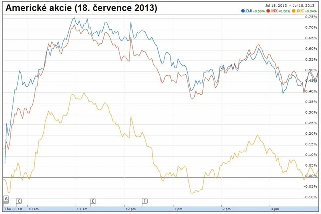 Po pozitivním středečním reportu se dařilo i IBM, jejíž akcie po zvýšení výhledu celoročního zisku na akcii na 16,90 USD posílily o 1,77 %. Rovněž SanDisk (+2,96 %) zveřejnil ve středu velmi solidní výsledky (zisk na akcii 1,06 USD, tržby 1,48 miliard USD) a i on zvýšil výhled tržeb ve třetím čtvrtletí, a to na 1,53 až 1,58 miliardy USD.