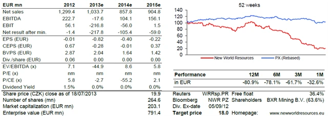Erste snižuje doporučení na akcie NWR z "držet" na "redukovat" s cílovou cenou 18 Kč na akcii kvůli 15% snížení odhadů cen uhlí a 25% snížení odhadu produkce NWR, což je jen částečně vyváženo poklesem nákladů.