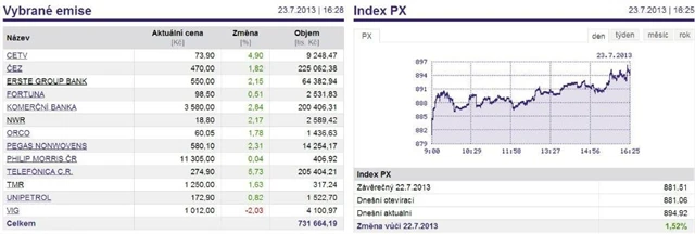 Nejvíce se dařilo cenným papírům Telefóniky C.R. (+5,73 %) a CETV (+4,90 %). O více než dvě procenta podražily i akcie NWR (+2,17 %) a bankovních titulů - Komerční banky (+2,84 %) i Erste Group Bank (+2,15 %).
