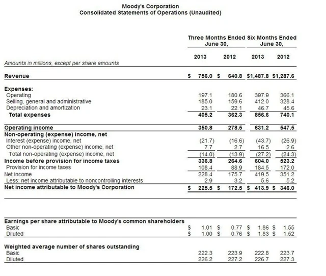 Příjmy analytické divize, která prodává finanční výzkumy, údaje a software pro hodnocení rizik, stouply o deset procent na 218,7 milionu USD. Příjmy divize firemních financí vzrostly o 37 % na 262,9 milionu USD. Firmy, které vydávají dluhopisy platí Moody's za hodnocení jejich dluhu, což pomáhá investorům při rozhodování, jaká je pravděpodobnost krachu firmy.