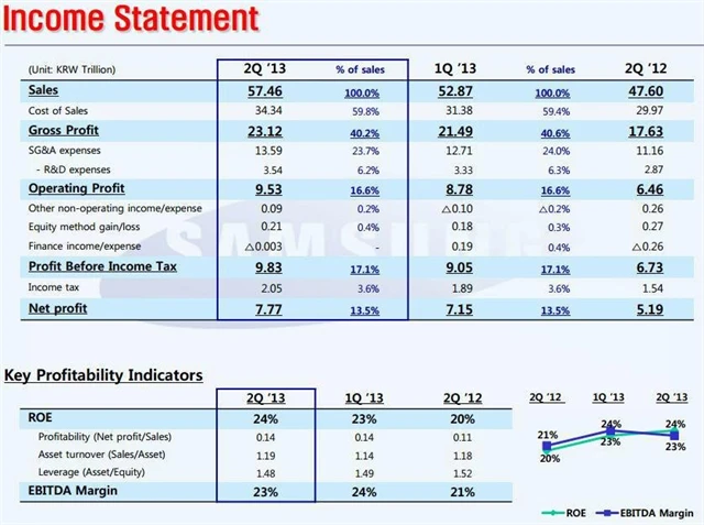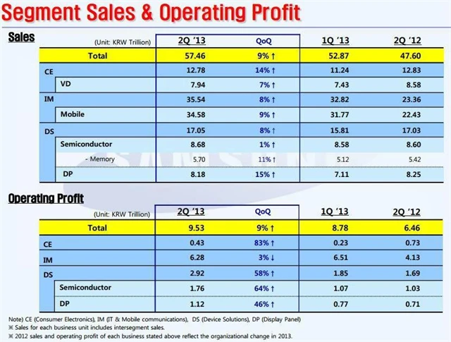 Zisky v divizi mobilních telefonů, která je pro firmu největším zdrojem příjmů, stouply meziročně o 52 % na skoro 6,3 bilionu wonů. Ve srovnání s prvním kvartálem to však představovalo pokles o 3,5 %.