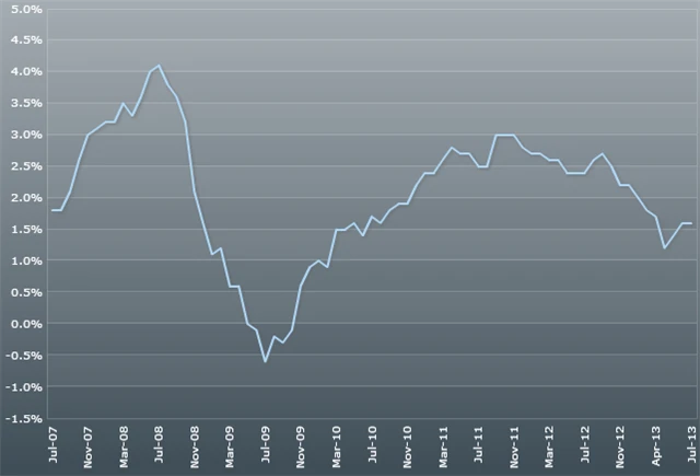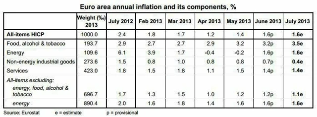 Míra inflace v eurozóně zůstala v červenci podle prvního rychlého odhadu na červnových 1,6 %. Ve srovnání s loňským červencem však tempo růstu spotřebitelských cen výrazně zpomalilo. V červenci 2012 inflace činila 2,4 %. Informoval o tom dnes evropský statistický úřad Eurostat.