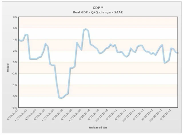 Hospodářský růst byl ve druhém čtvrtletí podpořen oživením podnikatelských výdajů, stoupajícím exportem a zpomalením poklesu vládních výdajů. Tempo růstu ekonomiky USA se nicméně již třetí čtvrtletí za sebou drželo pod 2% hranicí, která obvykle nestačí k výraznějšímu snížení nezaměstnanosti.