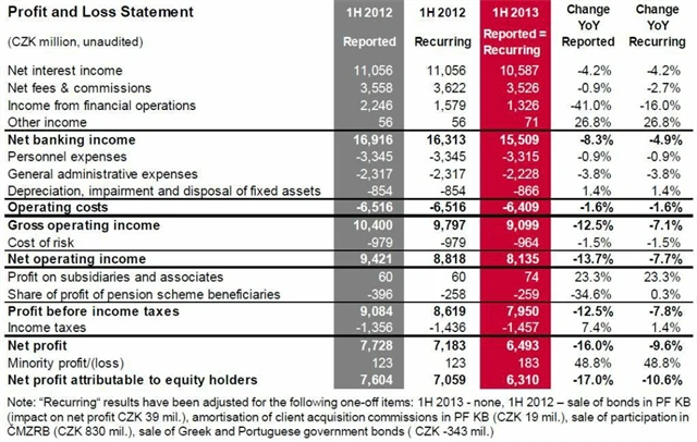 V celém prvním pololetí 2013 Komerční banka hospodařila s čistým ziskem 6,31 miliardy Kč, před rokem to bylo 7,6 miliardy.
