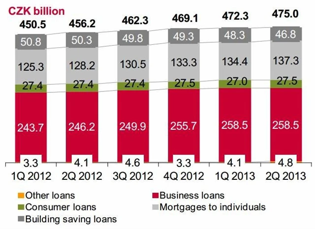 Úvěrové portfolio ve druhém kvartálu dále vzrostlo. Dařilo se například segmentu hypoték (+7,2 %). Celkově banka poskytla úvěry za 475 miliard Kč, meziročně o 4,1 % více.