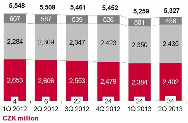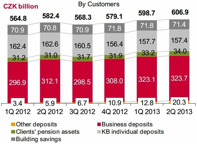 Přibylo také vkladů klientů, a to o 1,8 % na 591 miliard Kč. Firmy měly uloženo v bance o 3,7 % více než před rokem (323,7 miliardy Kč), soukromé vklady naopak klesly o 3,2 % na 157,4 miliardy Kč.