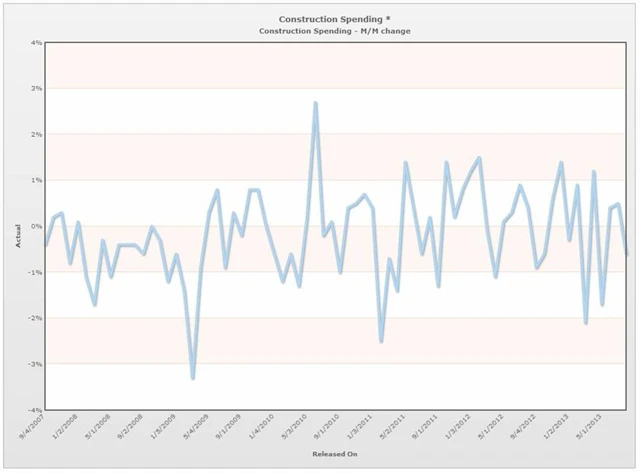 Výdaje na stavební projekty v červnu ve Spojených státech klesly o 0,6 %. Předpokládal se růst o 0,4 %. Údaje za květen byly revidovány z +0,5 % na na +1,3 %.