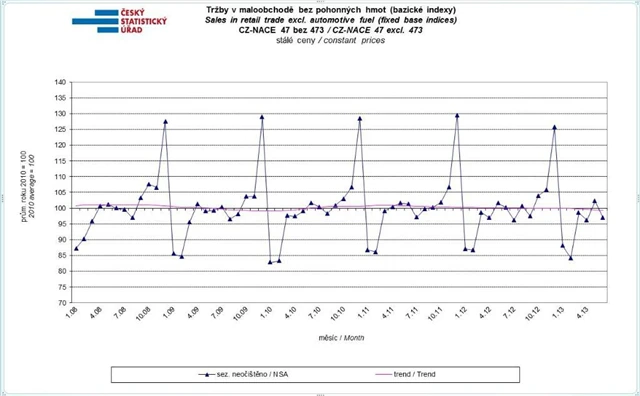 V maloobchodě včetně prodeje pohonných hmot (CZ-NACE 47) sezónně očištěné tržby klesly reálně meziměsíčně o 2,2 % a meziročně očištěné o vliv počtu pracovních dní o 2,6 %. Neočištěné tržby klesly meziročně o 3,6 %, v tom za pohonné hmoty o 4,8 %, potraviny o 4,5 % a nepotravinářské zboží o 2,5 %.
