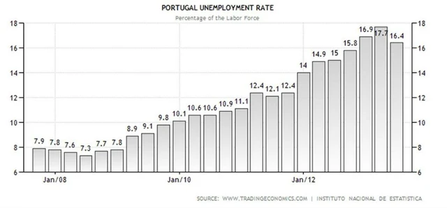 Míra nezaměstnanosti v Portugalsku ve druhém čtvrtletí poprvé za dva roky klesla a činila 16,4 %. Ukázaly to dnešní údaje tamního statistického úřadu (INE). Podle agentury Reuters jde o další z nejistých signálů, že vleklá recese už je v Portugalsku na ústupu. V prvním čtvrtletí byla ještě míra nezaměstnanosti rekordních 17,7 %.