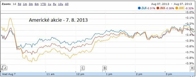 Americké akcie ve středu ztrácely kvůli obavám z dalšího rozhodování Fedu. Po projevech šéfů jeho jednotlivých poboček a výrazně dobré bilanci zahraničního obchodu nyní investoři vyhlížejí jakákoli data z ekonomiky, která by potvrdila, nebo naopak oddálila očekávané zářijové omezení programu odkupů dluhopisů ze strany Fedu.